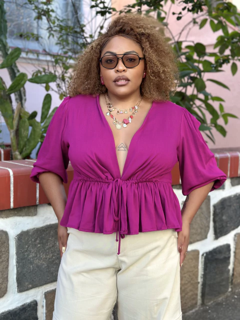 Bata em Viscolinho Fúcsia (100% Viscose) com manga 3/4 e punho em elástico, possui franzido na parte frontal, na altura da cintura, decote em V e amarração abaixo do busto para regular a peça.