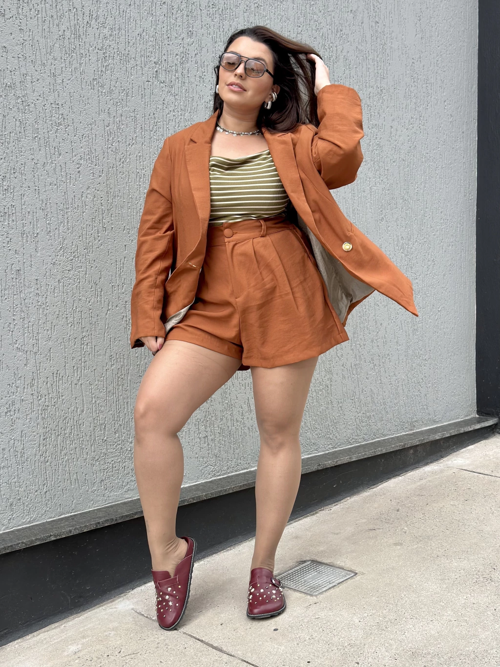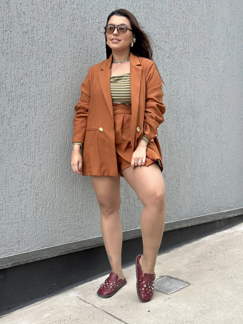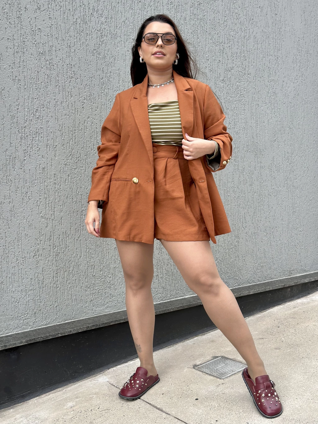 Blazer de Alfaiataria de Viscose (90% Viscose 10% Poliéster) em modelagem OverSized com gola alongada, bolsos fake estilo lapela nas duas frentes, e botões bege com dourado para abotoadura transpassada. Possui forro de Poliéster por todo o modelo, inclusive nas mangas, junto de botões no punho na cor bege com dourado.