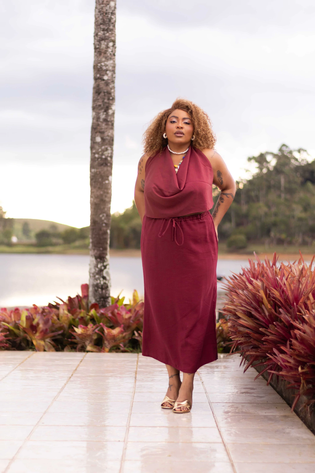 Blusa frente única em Alfaiataria de Viscose (92% Viscose 8% Poliéster) na cor cereja. Possui amarração na nuca e costas, possibilitando a regulagem de ambas as partes no corpo. Dupla forração na parte da frente da peça com efeito degagê no decote trazendo leveza e sensualidade para o corpo. Possibilidade de diferentes tipos de amarração, faz conjunto com Saia Fluir Cereja.