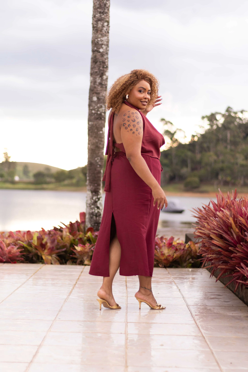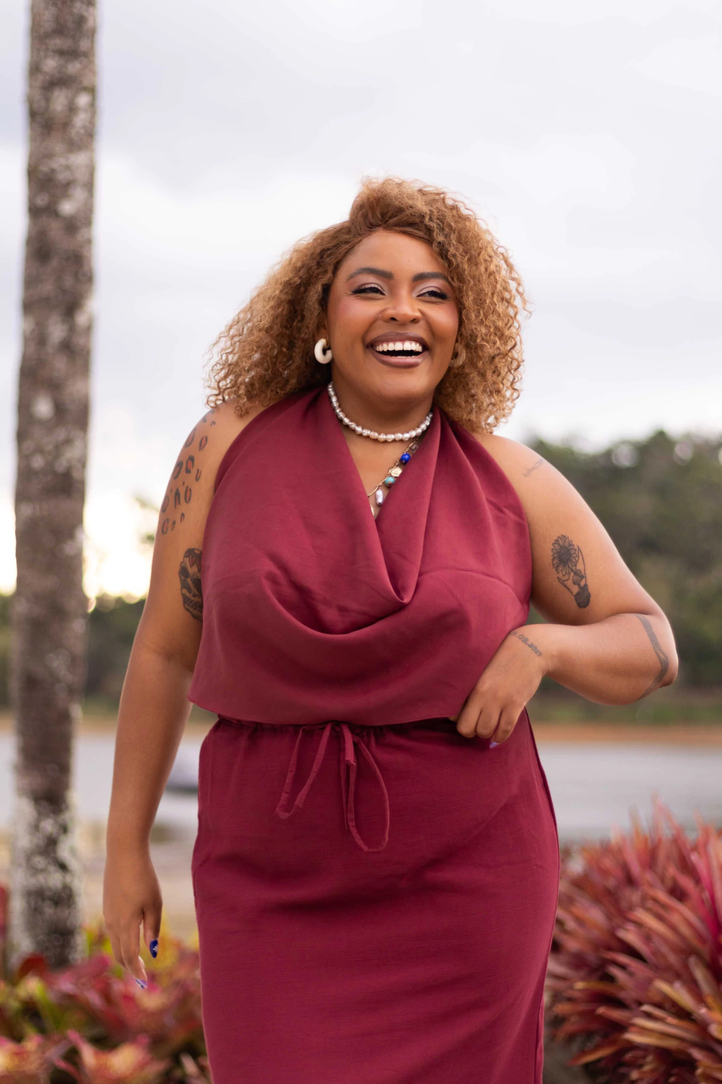 Naira possui 113cm de busto e veste tamanho GG (modelo de pele negra com cabelo médio loiro)