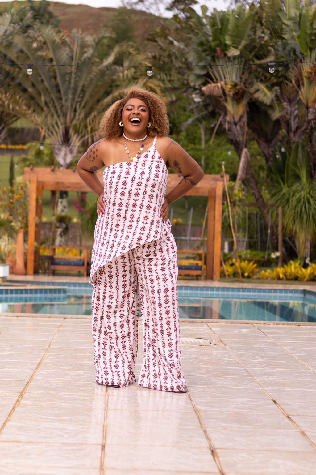Naira possui 113cm de busto e veste tamanho GG (modelo de pele negra com cabelo médio loiro)