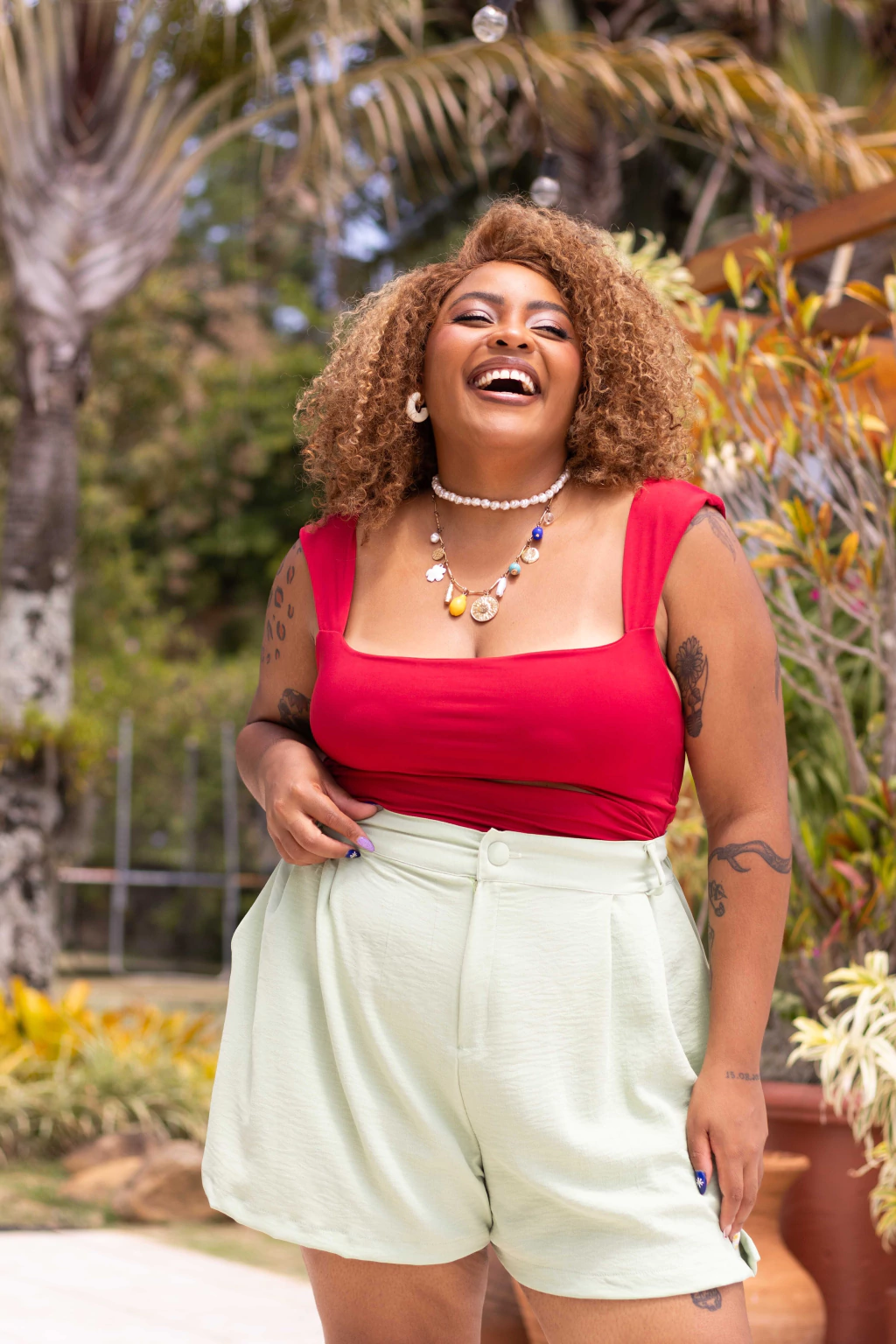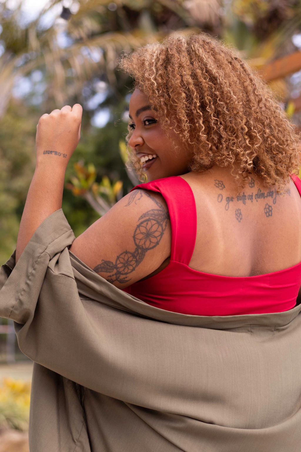 Naira possui 113cm de busto e veste tamanho GG (modelo de pele negra com cabelo médio loiro)