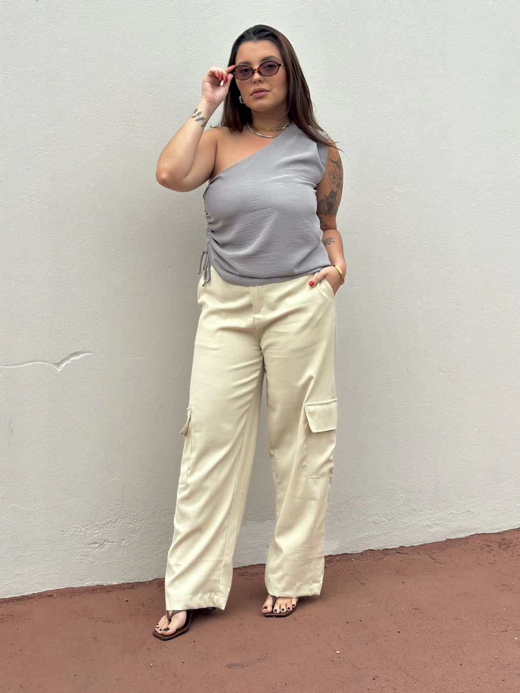 Blusa com modelagem um ombro só no tecido Crepe Airflow (97% Poliéster 3% Elástano) na cor cinza. Possui drapeado no ombro e franzido na lateral da peça regulável por canaleta com cadarço.