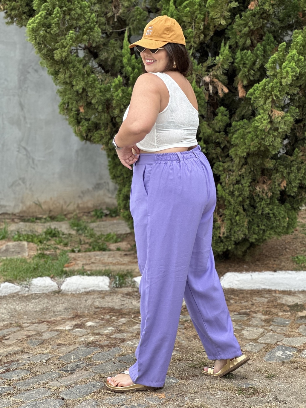 Calça em modelagem reta de Alfaiataria, cintura alta, bolso faça e pregas frontais.