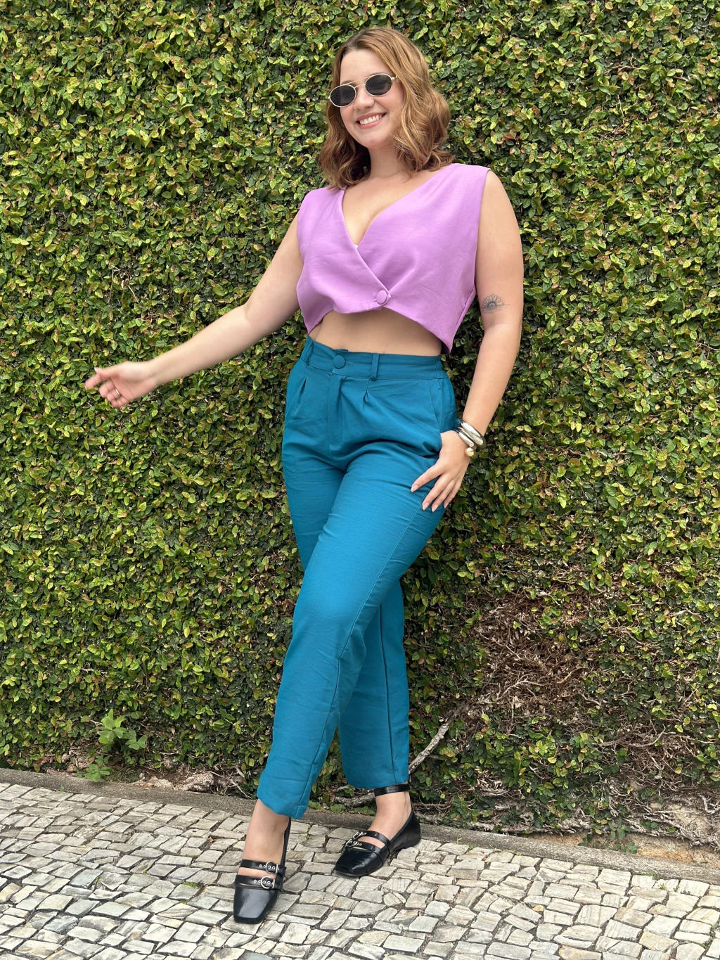Em Alfaiataria de Viscose (92% VISCOSE 8% POLÍESTER), com botão encapado do mesmo tom e tecido e zíper.