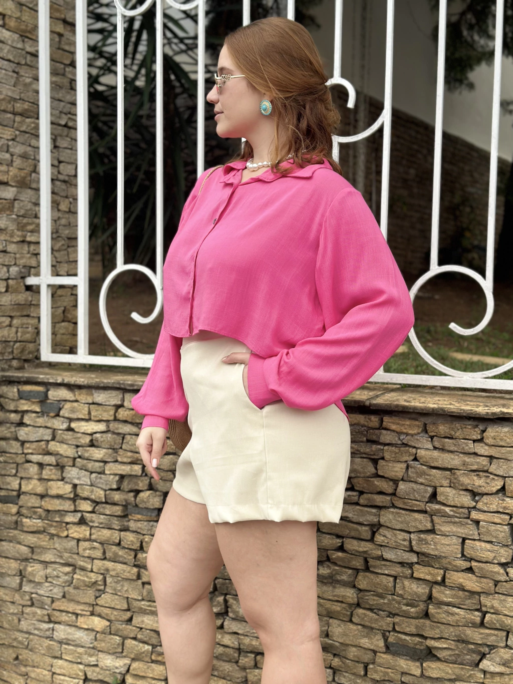 Camisa em Viscolinho (100% Viscose) na cor Rosa Pink. Modelagem soltinha no corpo com frente mais curta que as costas (estilo mullet). Possui botões em metal tanto na parte central da peça quanto nos punhos. Mangas com comprimento longo e costas com corte arredondado.
