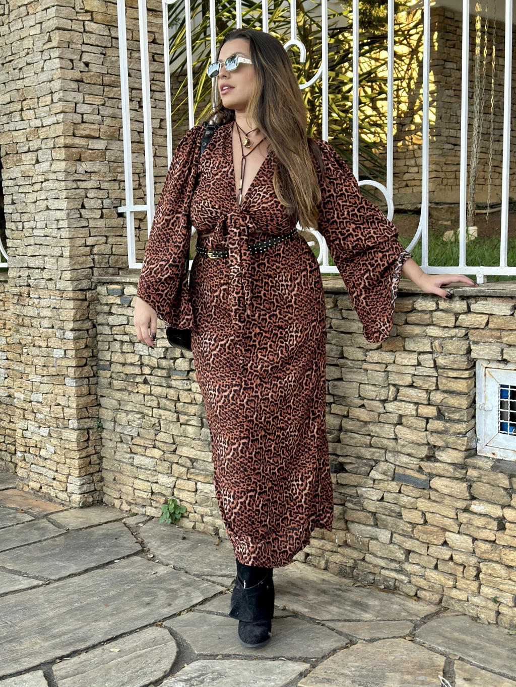 Cropped com manga 7/8 evasê, em Viscolinho com temática Animal Print de Onça na cor Marrom com manchinhas pretas.
