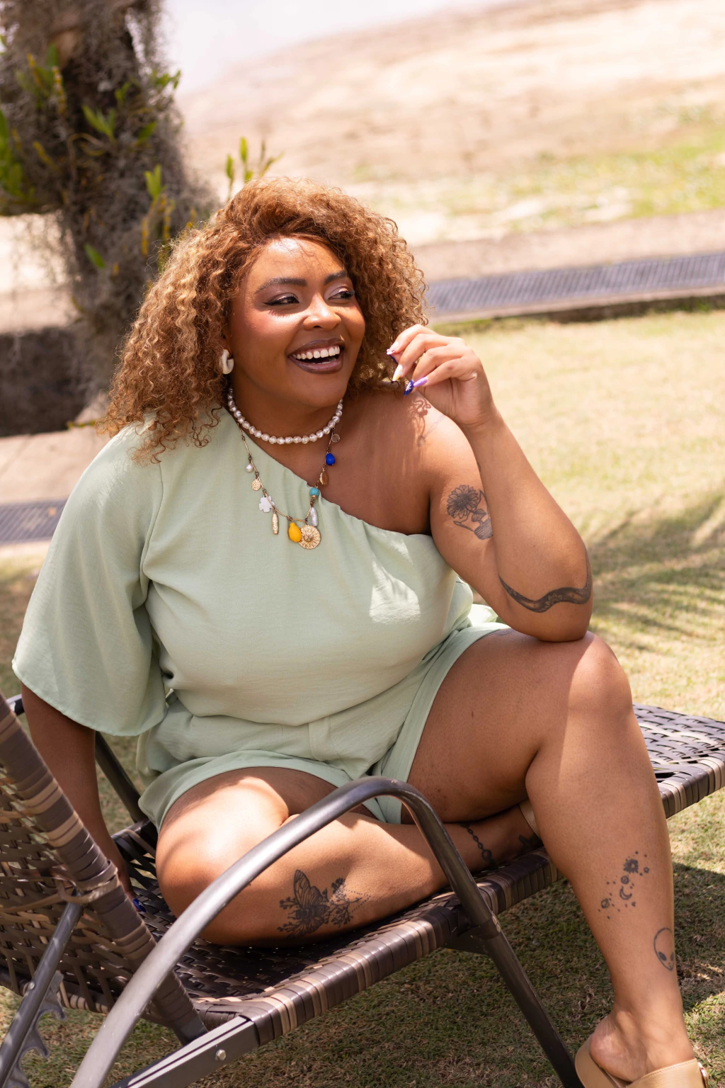 Naira possui 113cm de busto e veste tamanho GG (modelo de pele negra com cabelo médio loiro)