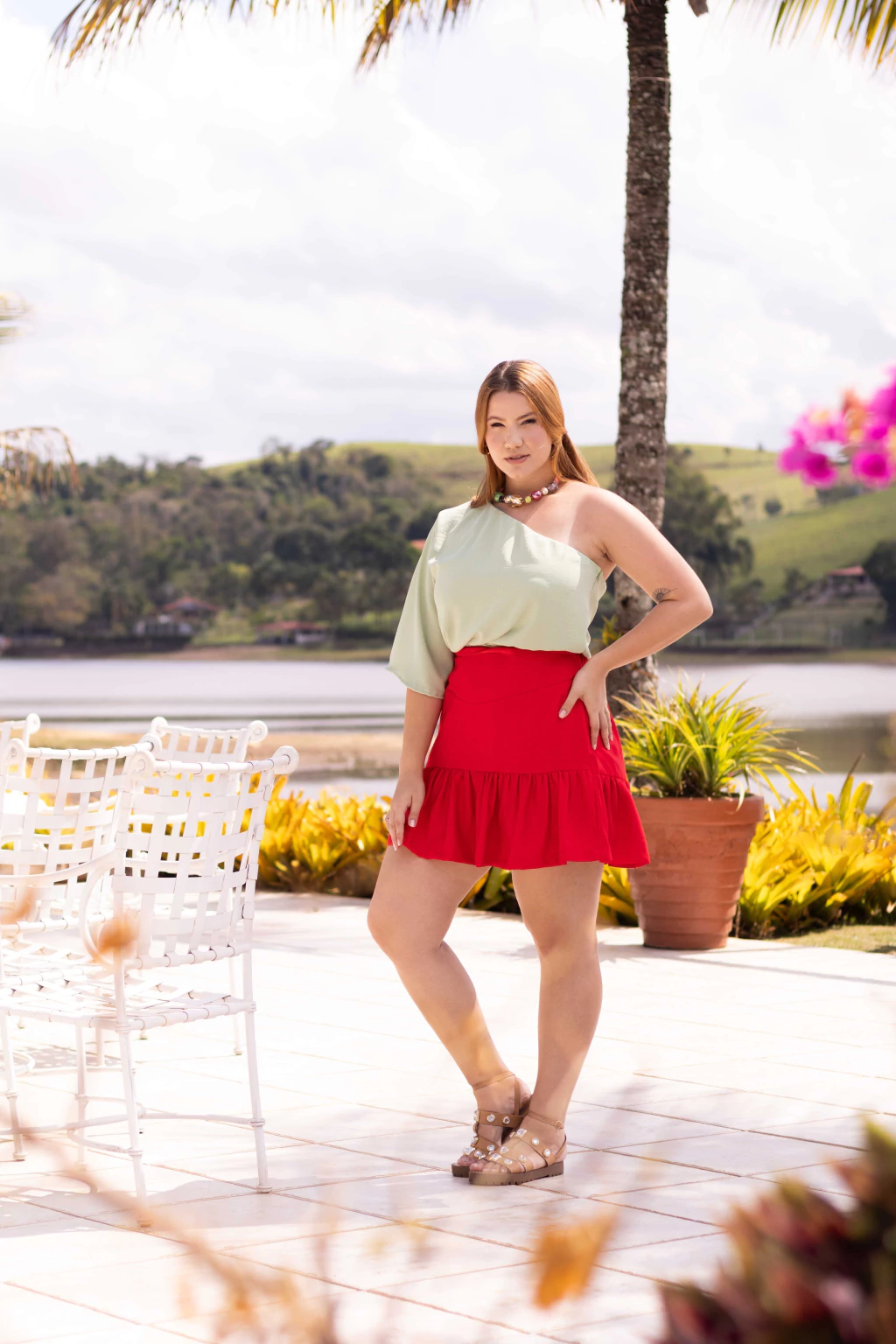 Cropped em Crepe Airflow (97% Poliéster 3% Elástano) na cor Verde Menta, com decote um ombro só e manga 3/4 estilo morcego (soltinha na barra e por todo o braço), com elástico por toda a cintura e decote na parte da frente, dando caimento soltinho na parte do busto, com zíper invisível na lateral.