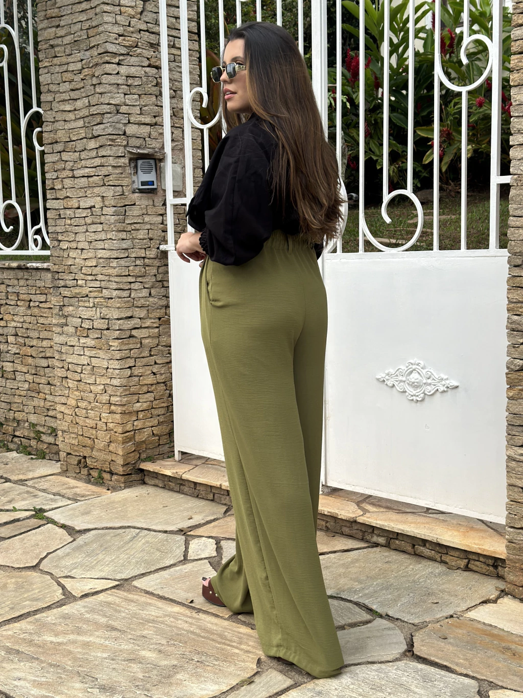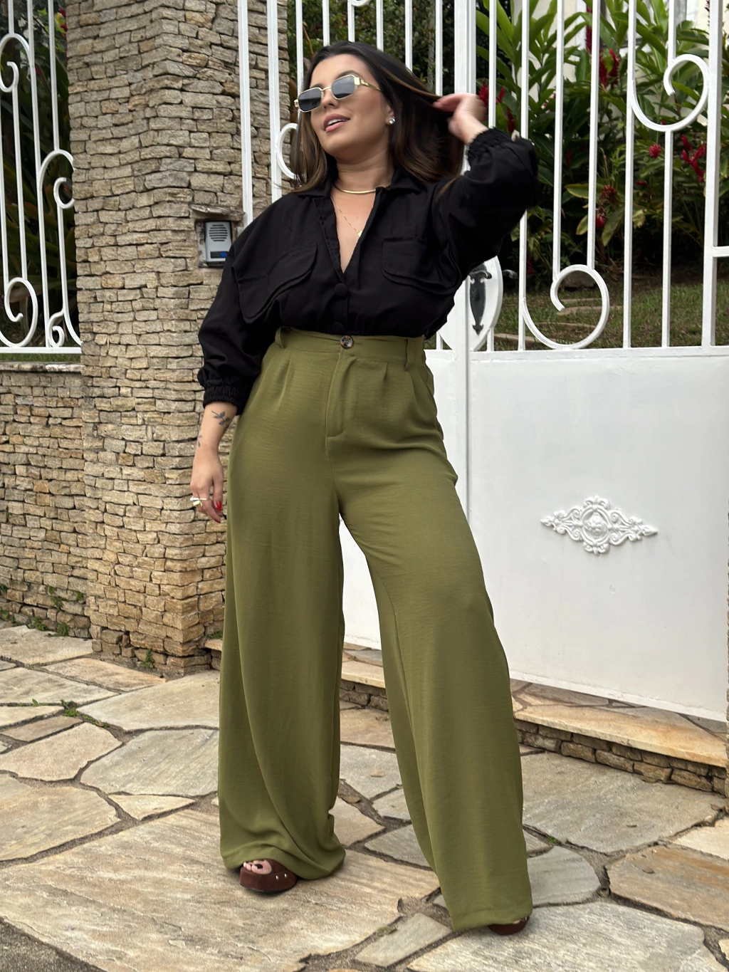 Cropped em Alfaiataria Marrant (90% Viscose 10% Poliéster) com gola Blazer, decote em V. Elástico na barra por toda a cintura e também nos punhos. Possui manga longa em modelagem morcego (sem costura entre ombro e braço). Detalhes frontais em bolso fake e botões encapados.