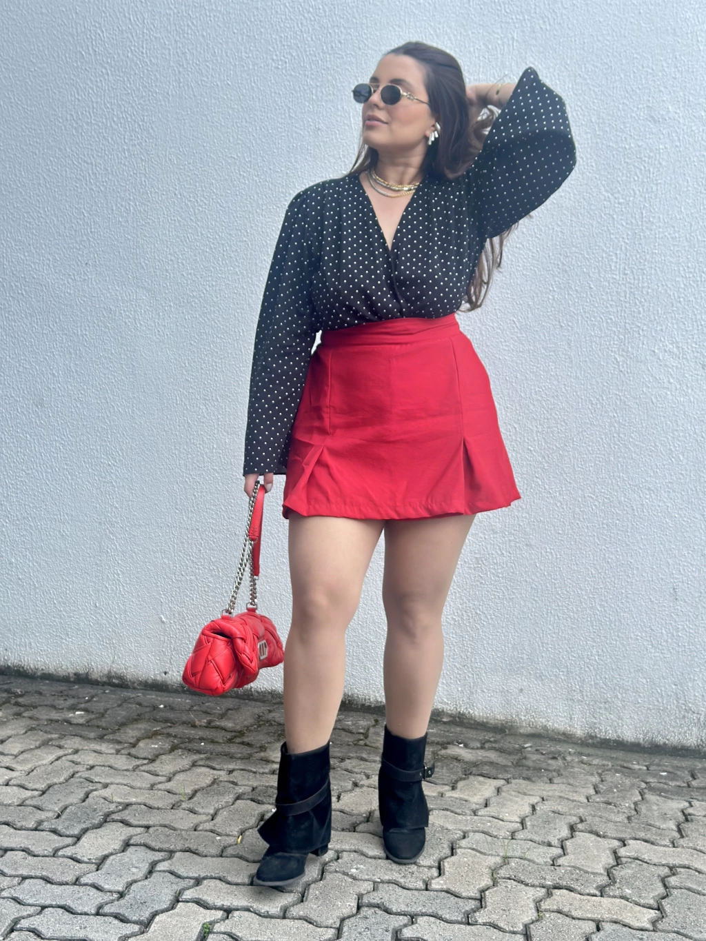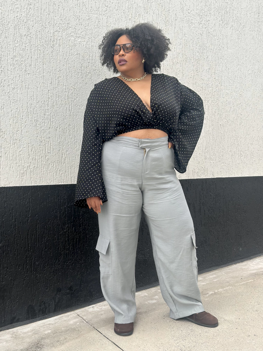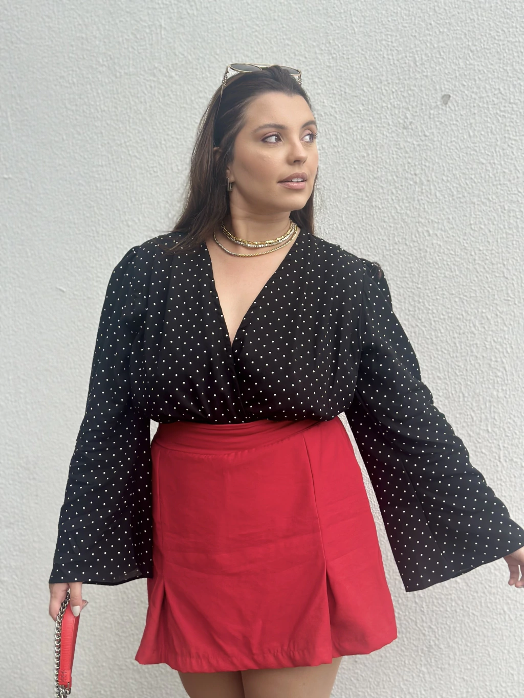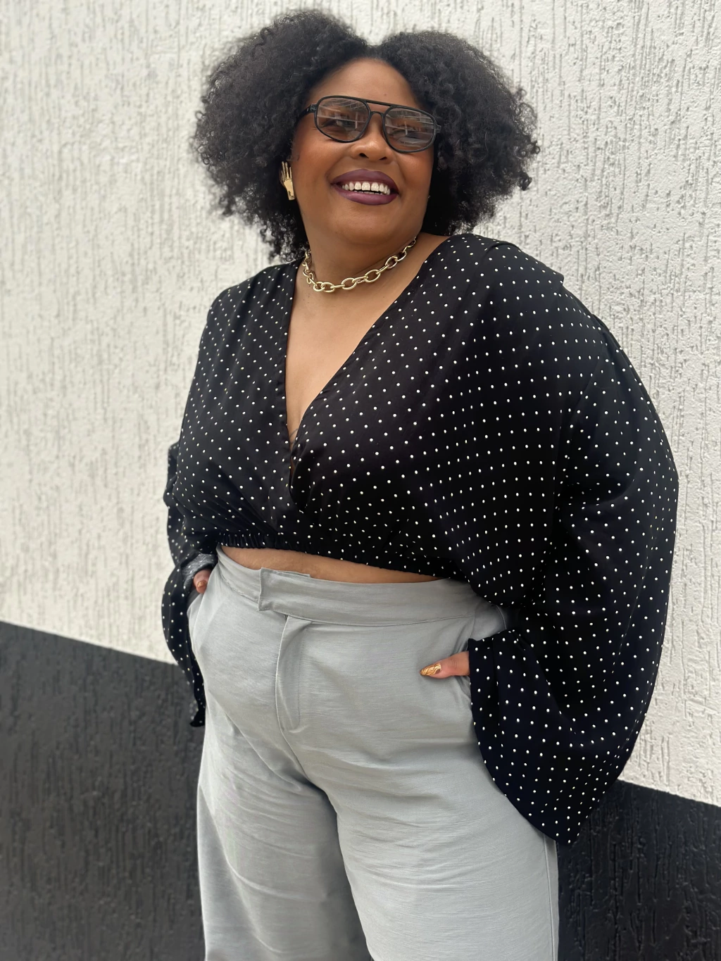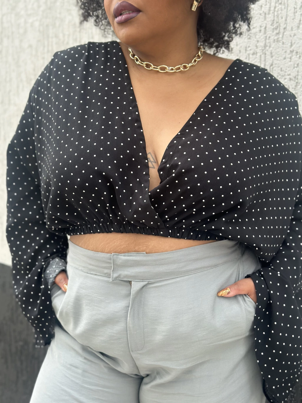 Cropped com manga 7/8 evasê, em Viscolinho de fundo preto com estampa de poá pequeno branco.