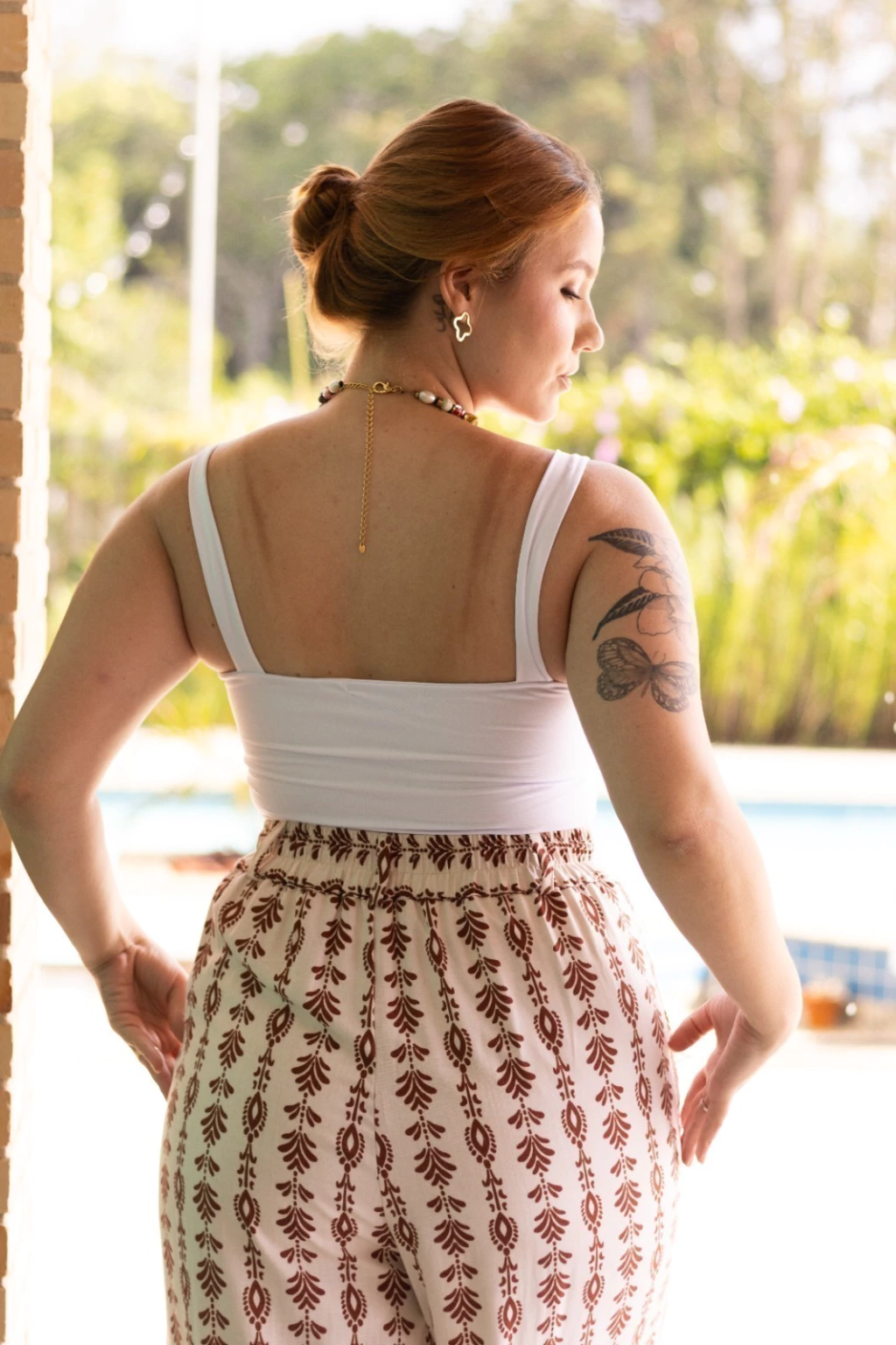 Pantalona em Viscolinho (100% Viscose) na cor Offwhite com estampa Arabesca em tons de Marrom Canela. Possui pala larga na cintura, zíper na lateral, elástico atrás, pregas frontais de alfaiataria e perna ampla e confortável. Perfeita para quem ama ter liberdade em pernas soltinhas e confortáveis sem marcar nada!