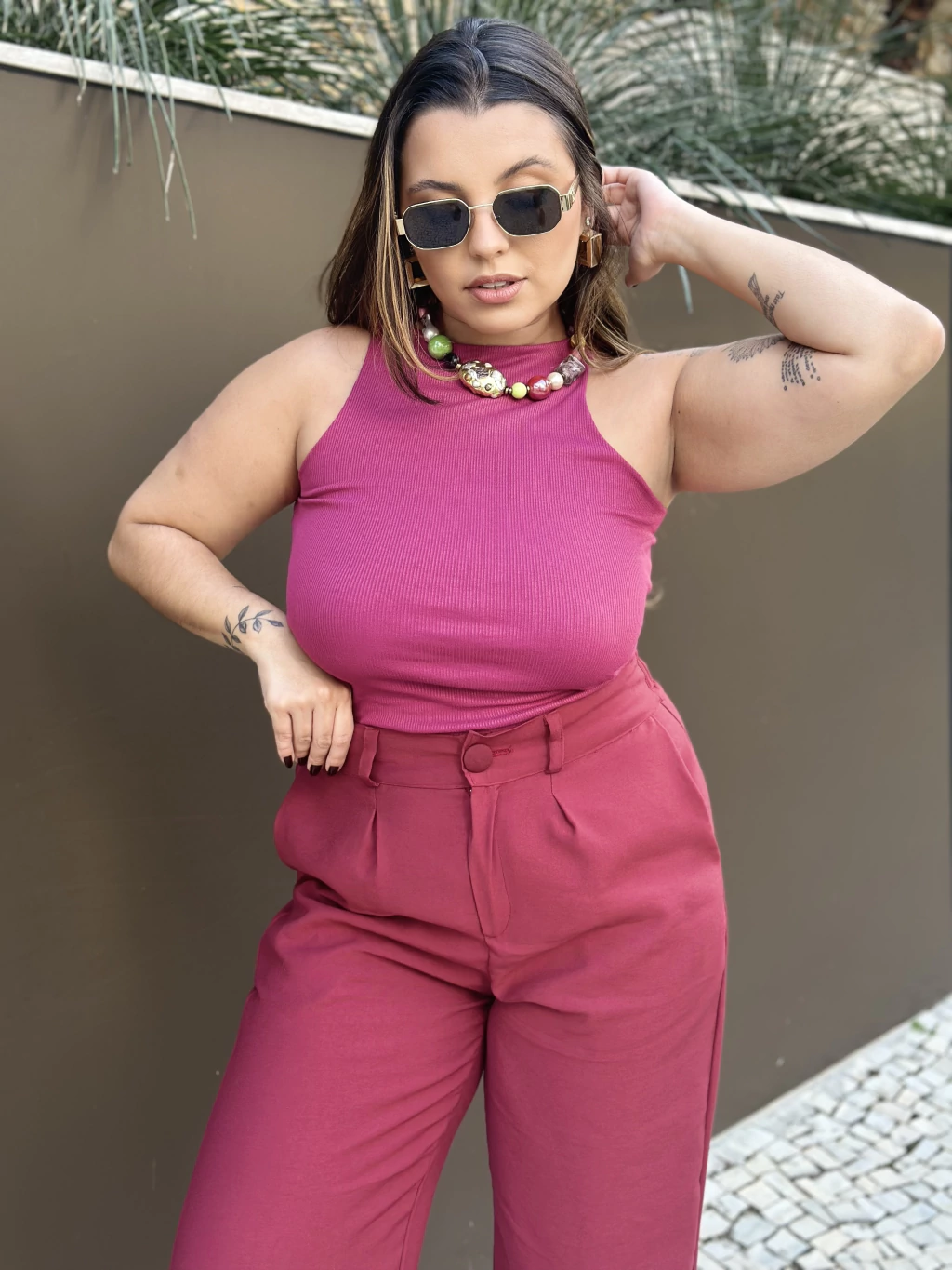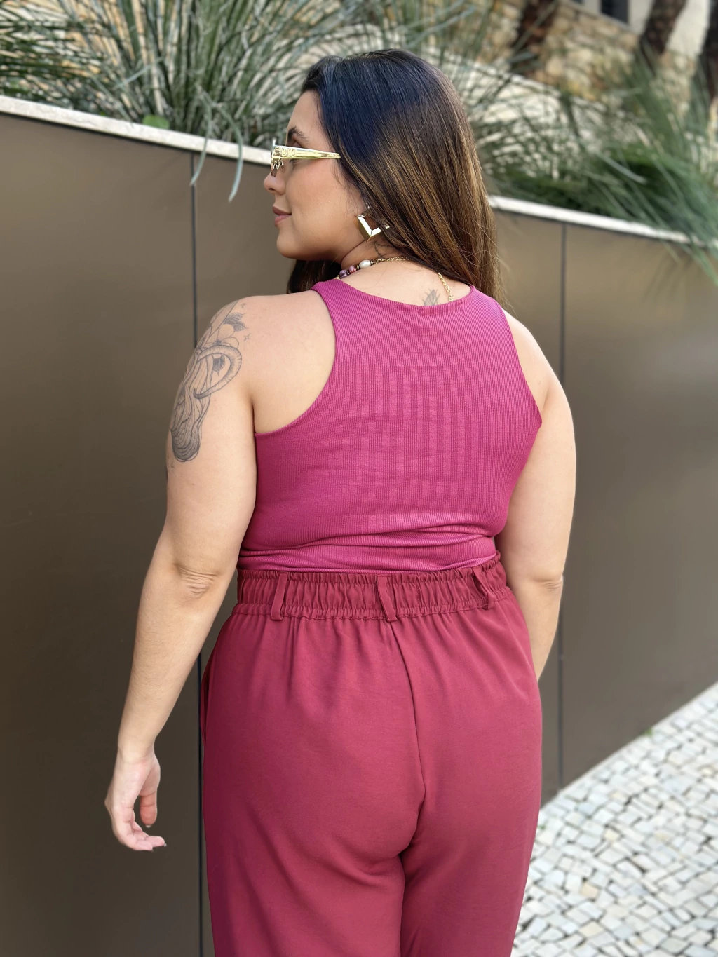 Regata em malha canelada de Viscose com forração dupla na frente e decote nadador.