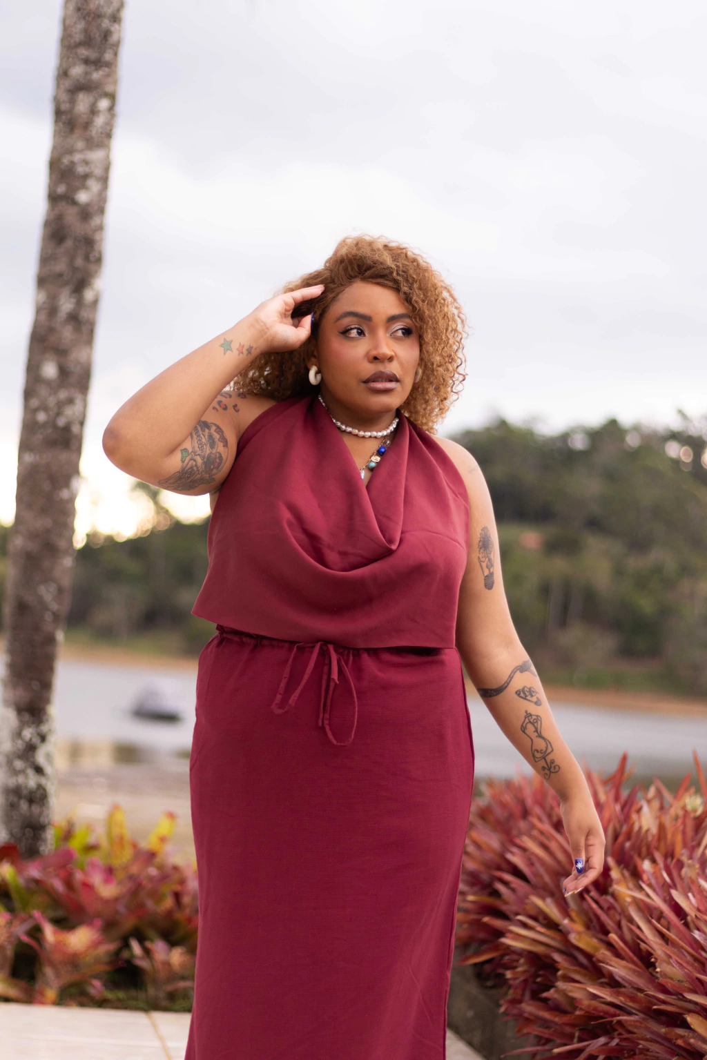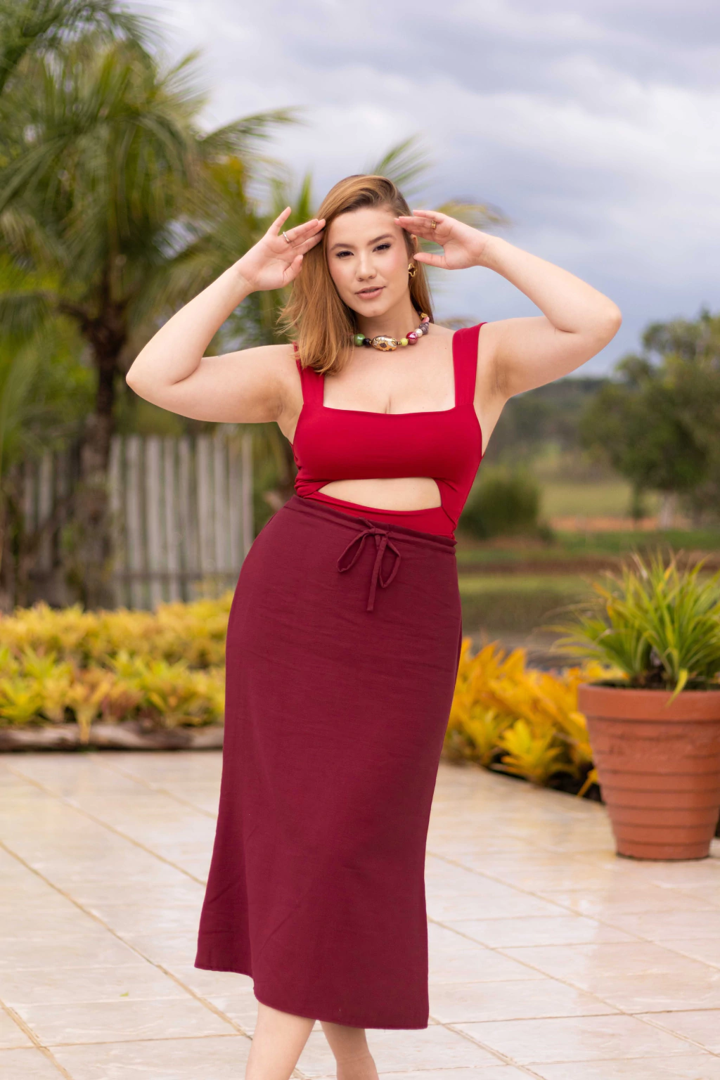 Saia em Viscose de Alfaiataria (92% Viscose 8% Poliéster) com modelagem estilo sereia - afunila até a altura do joelho e depois abre até a barra, em comprimento longo mas que não esbarra no chão. Possui cintura com frente regulável por cadarço que amarra e elástico na parte de trás.