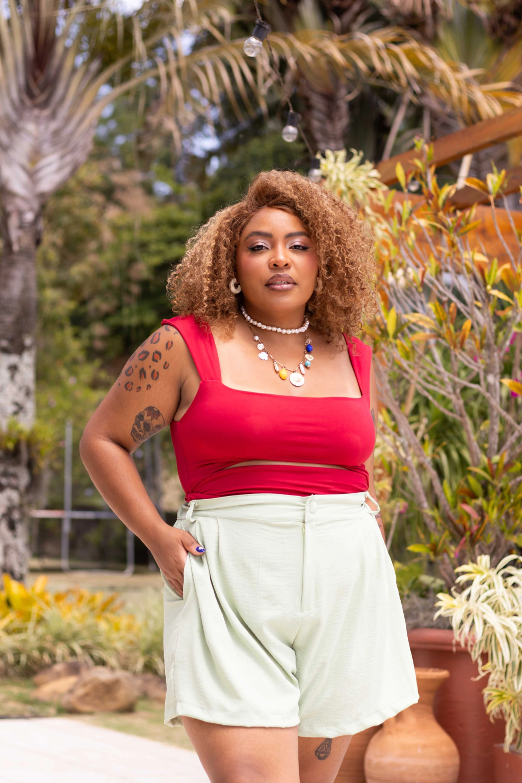Naira possui 123cm de quadril e 99cm de cintura - ela veste tamanho GG (modelo de pele negra com cabelo médio loiro)