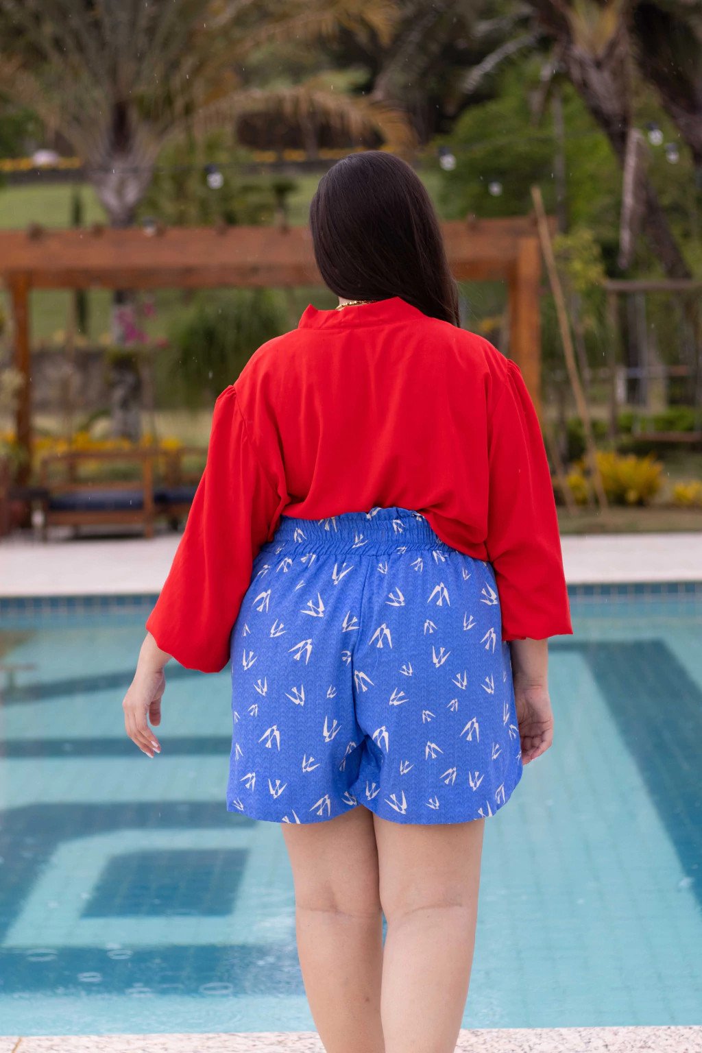 Short em Viscolinh (100% Viscose) com fundo Azul Céu e estampa de passarinhos brancos. Elástico por toda a cintura com bolsos faca na parte frontal do short, perna soltinha e acabamento arredonda na lateral da barra. Não possui forro.