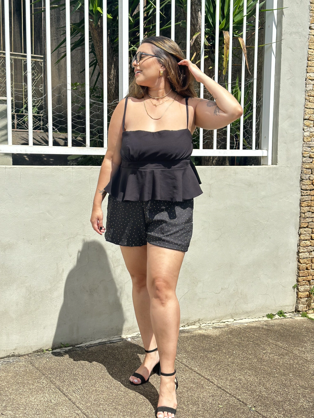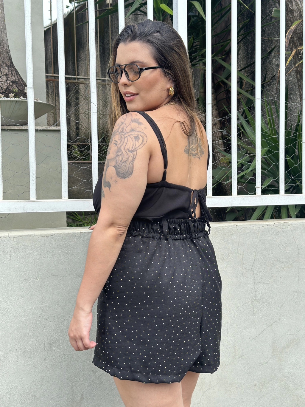 Short em Alfaiataria Sarjada de Viscose (Sarja leve) na cor Preta com hotfix aplicado de cor Prateada, com pala na cintura e frente reta sem detalhes.