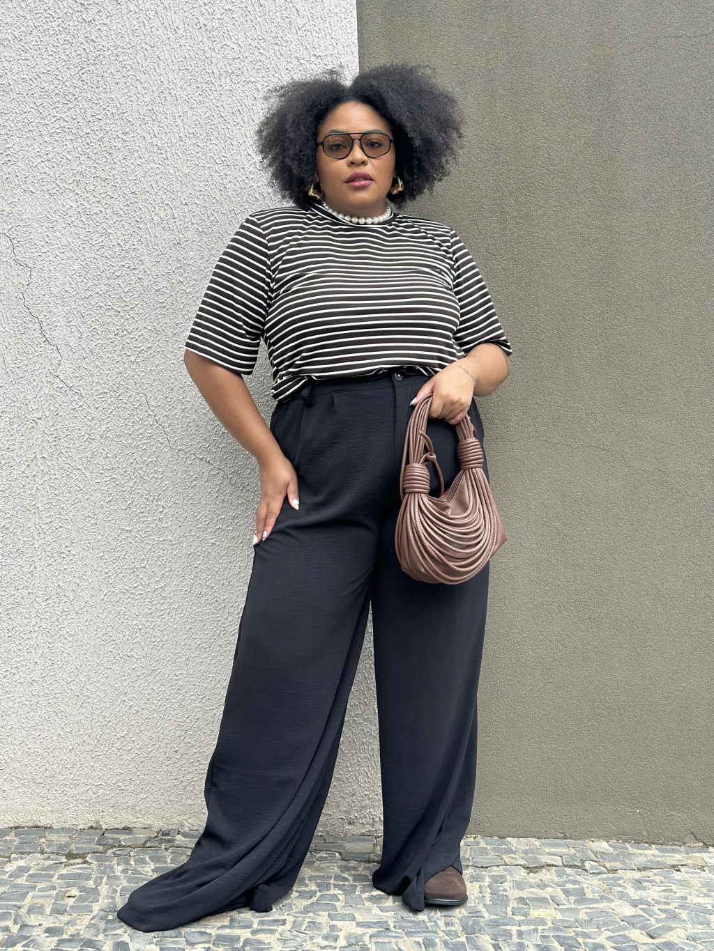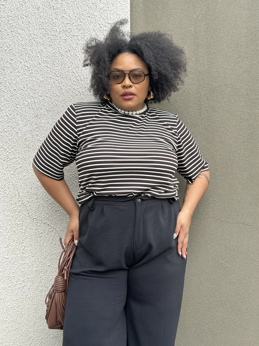 T Shirt em malha canelada de Viscose, com fundo preto e listras brancas. Possui gola careca com mangas soltinhas tampando até o cotovelo. Shape oversized por todo o corpo, comprimento até o início do quadril.