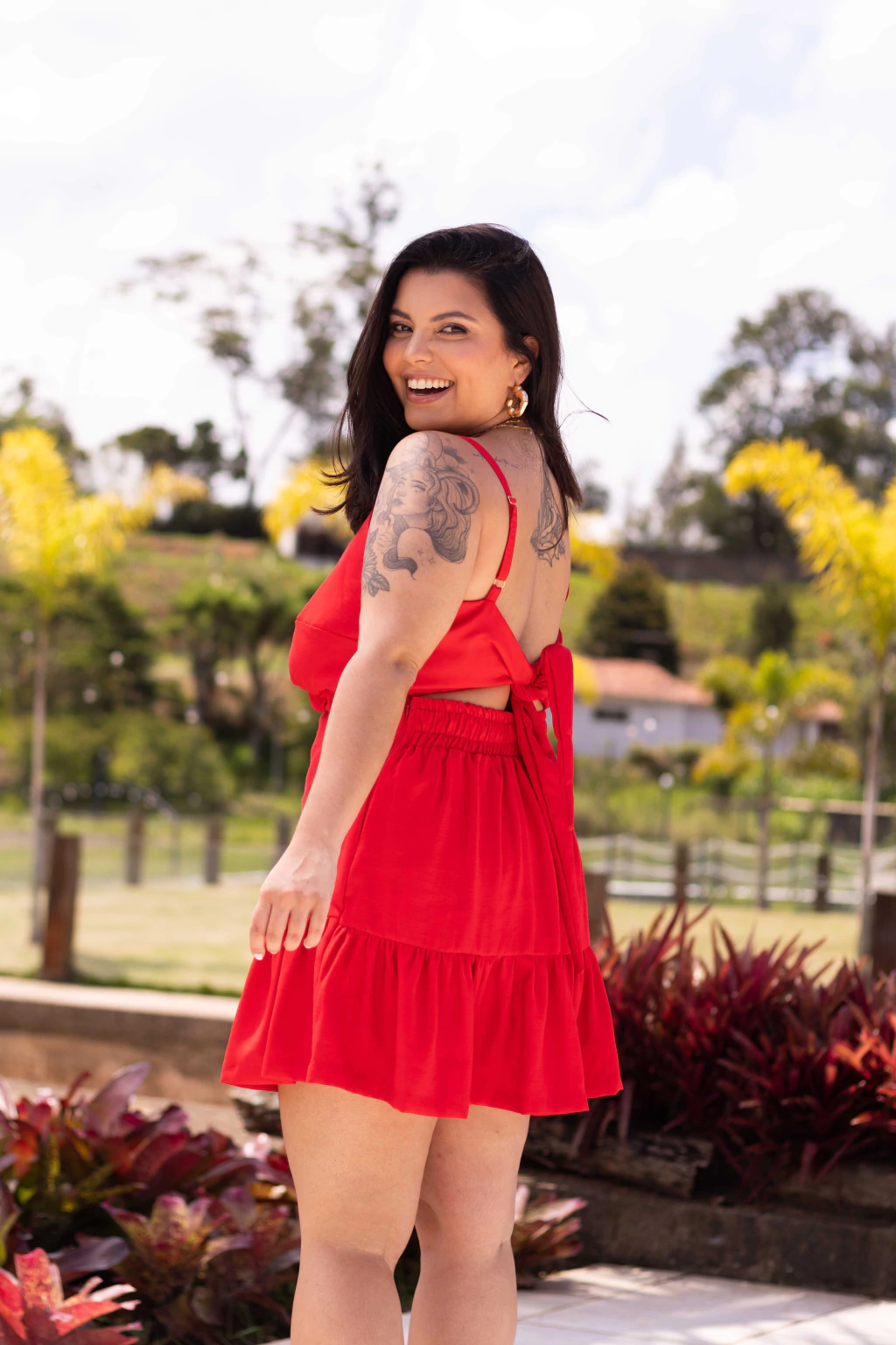 Top em Alfaiataria de Viscose (92% Viscose 8% Poliéster) na cor Vermelho com decote geométrico e recorte no meio, estilo meia taça. Possui alças finas com regulador e faixa para ajuste e amarração na parte das costas.