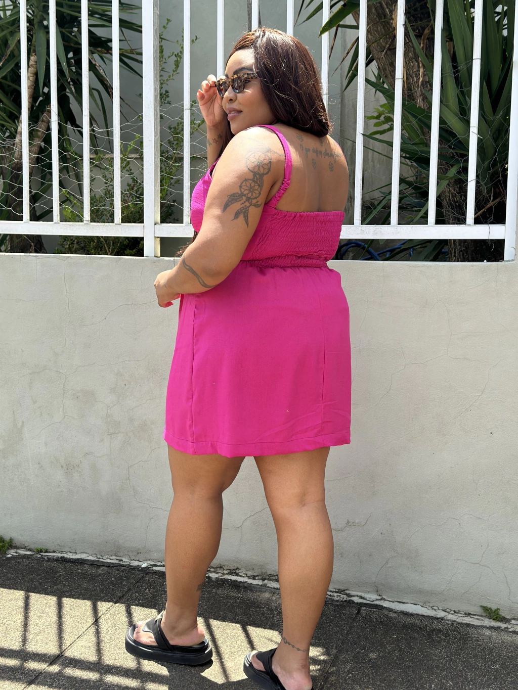 Vestido em Linho Misto (80% Viscose 20% Linho) na cor Rosa Pink. Comprimento curto, com saia soltinha no quadril para maior conforto e mobilidade, possui zíper na lateral e lástex na parte das costas. Conta com um busto todo prespontado, trazendo ainda mais charme para a peça. Alças finas mas que trazem sustentação ao decote meia taça.