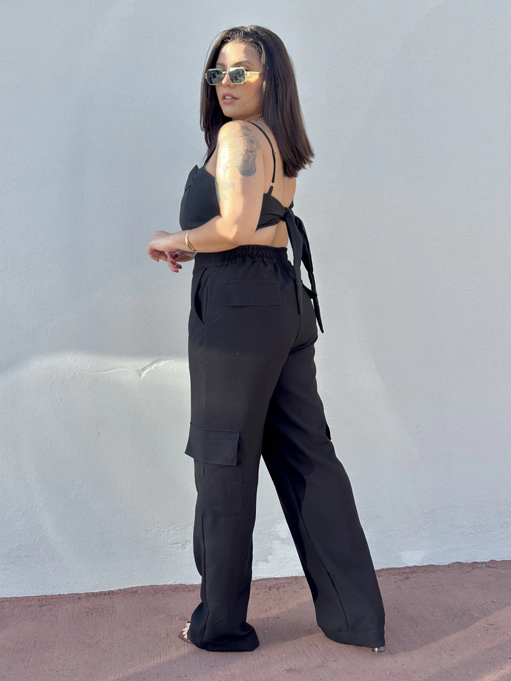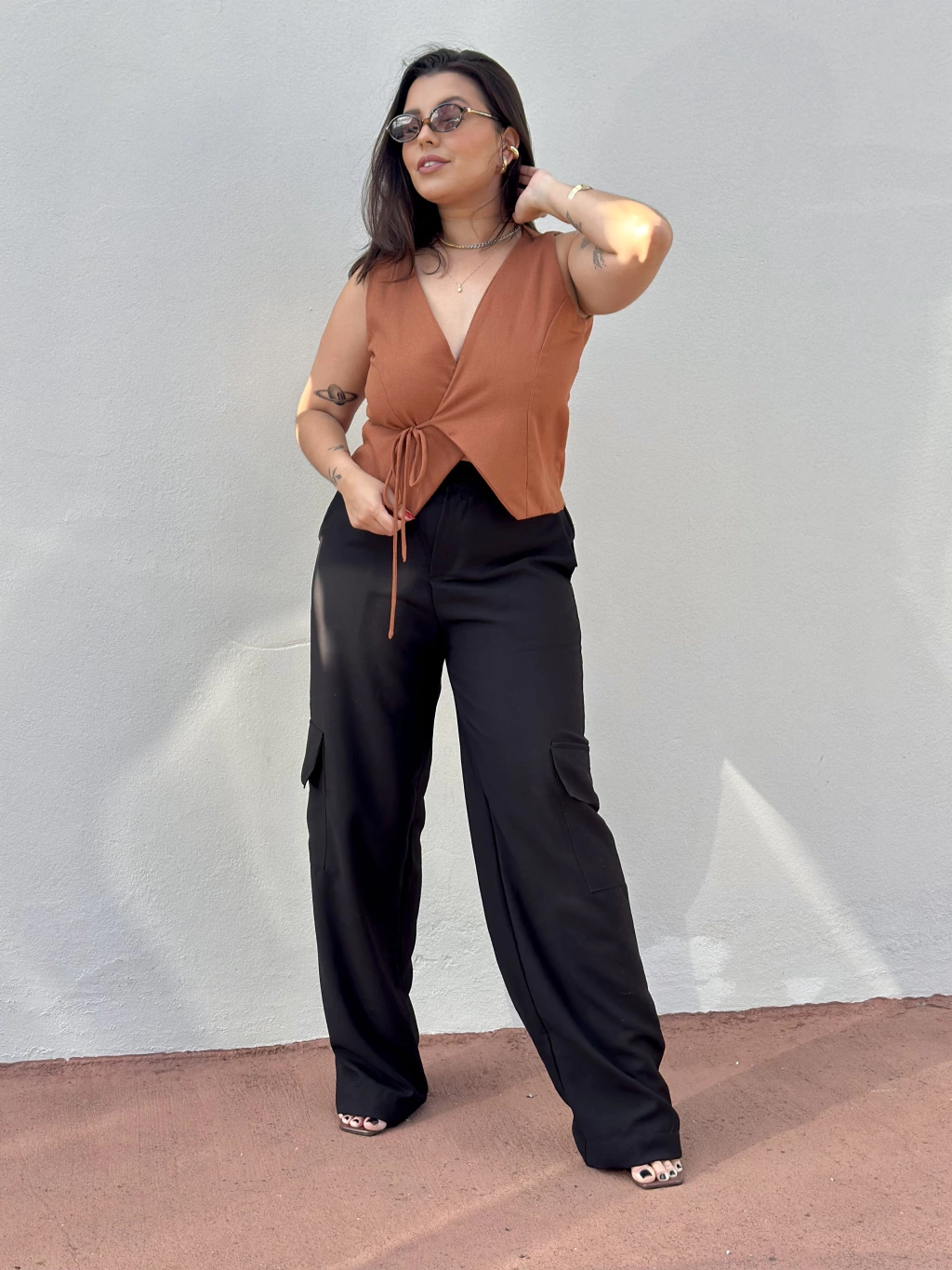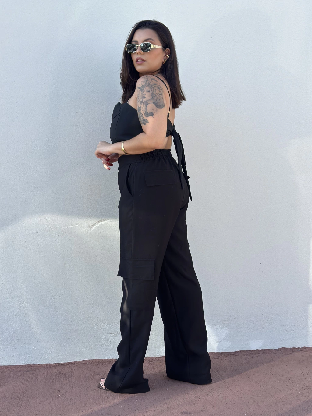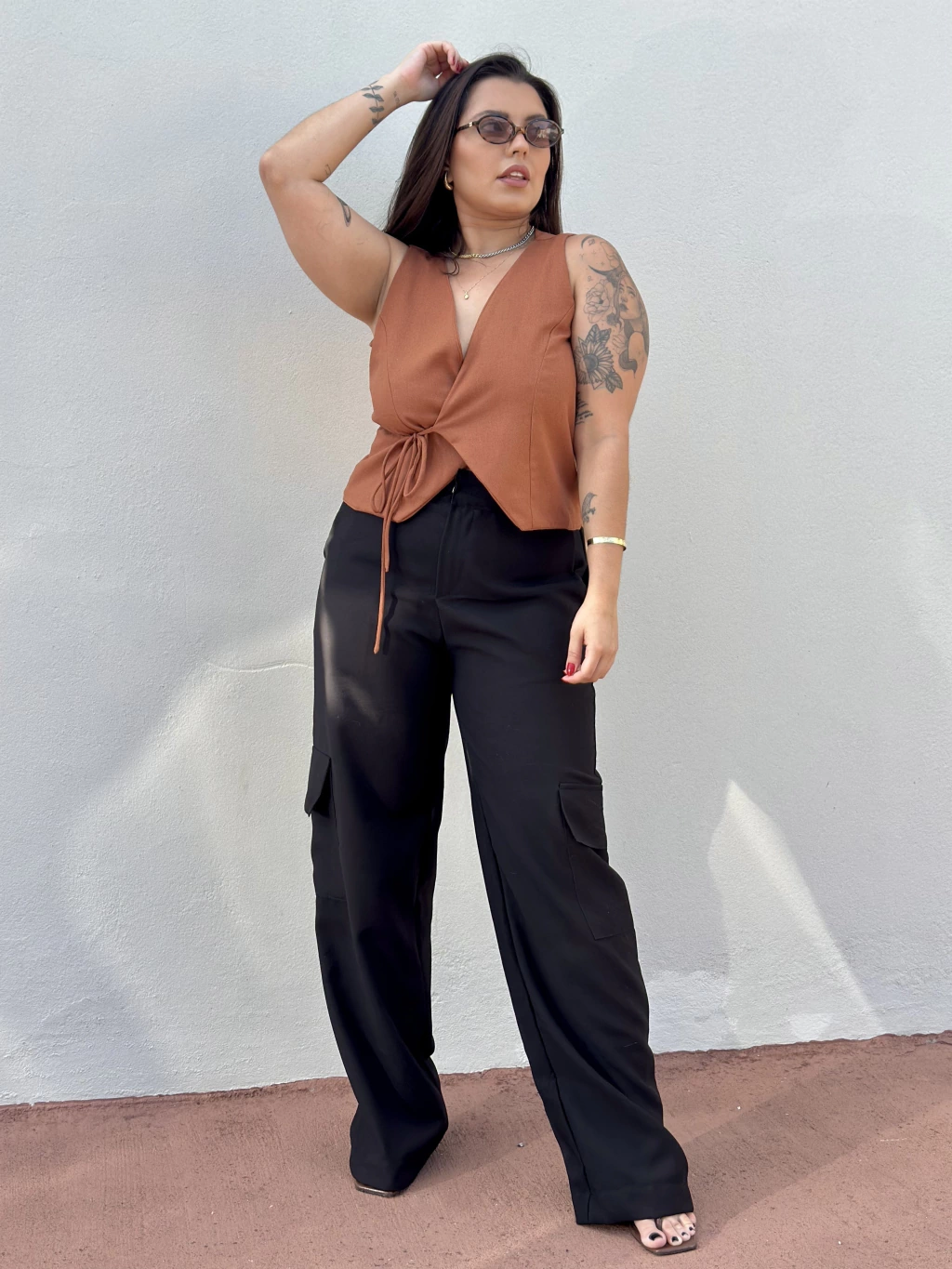 Calça em modelagem Wide Leg na Alfaiataria de Viscose (92% Viscose 8% Poliéster), com cintura alta e bolso faca nas laterais, cós em pala com fechamento por colchete e zíper frontal. Possui elástico atrás, bolsos fake na parte do bumbum e bolsos cargo na altura do joelho. Veste bem até 1,75m de altura.
